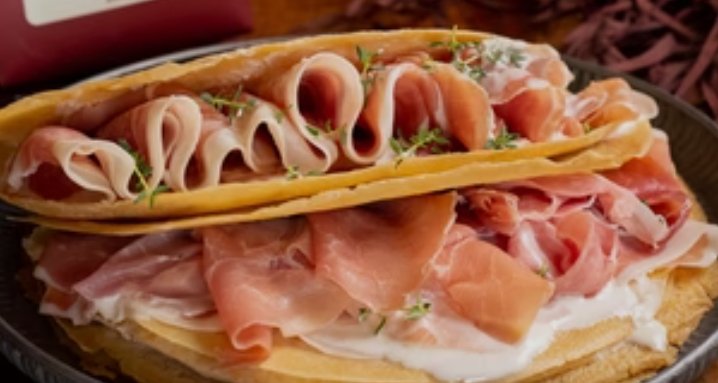 Crepes Salata Croccante ( impasto Senza Lievito) con Crudo di Parma Dop ,Stracciatella Granarolo ,Pomodorini , Rucola e olio bio