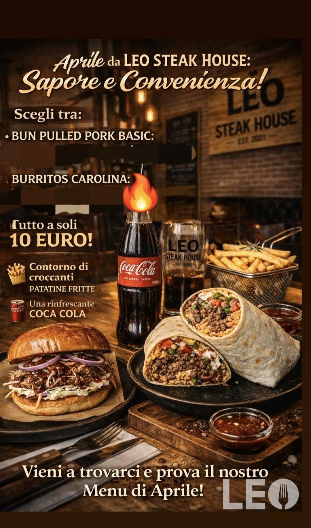 Scegliendo un panino o un burritos : 🍔 Burger Pulled Pork Basic composto da Bun al Sesamo Pulled Pork hom- made , insalata russa , patatine e Barbecue …….. 🌯 OPPURE BURRITOS CAROLINA composto da Totillas Pulled Pork hom- made, cipolla fritta , insalata , Patatine salsa Carolina , Onion Relish Piu🍟 Pataine fritte di contorno più 🥤Cocacola ✨️✨️✨️€10