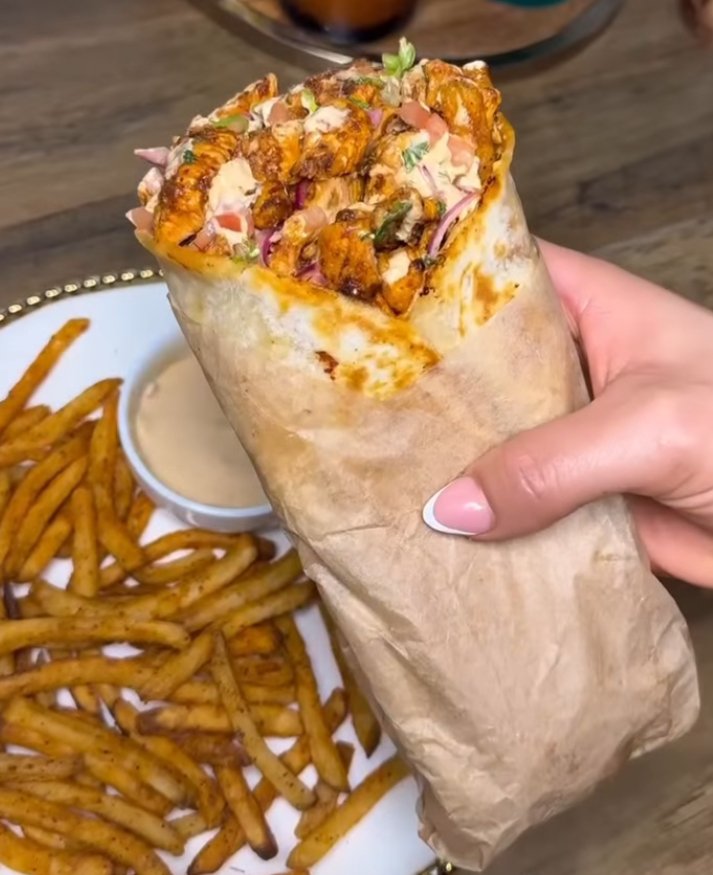 Tortillas Morbida , Straccetti di Pollo Fritti , Formaggio Cheddar sciolto ,Insalata Iceberg , Patatine Fritte e Salsa Sweetchili 🌯