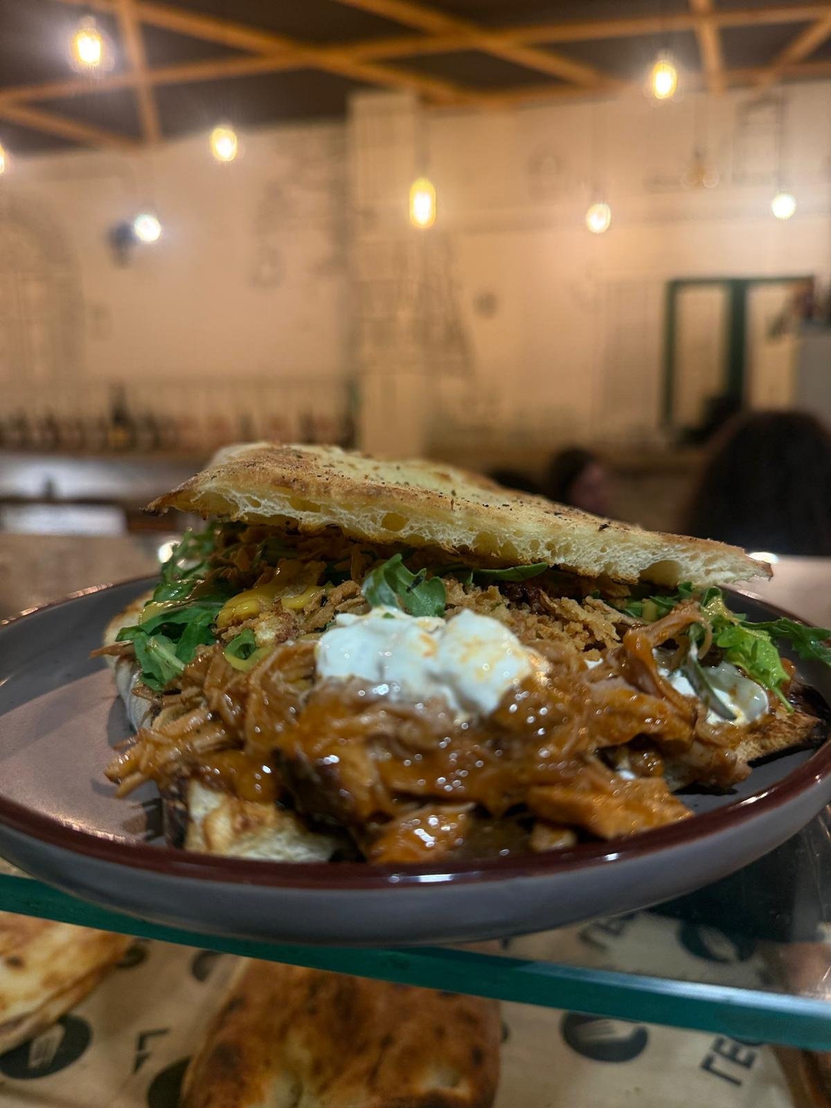 Schiacciata croccante , Pulled Pork (hom made) , stracciatella Bio , Pomodori secchi julien , Cipolla Croccante , Rucola e Salsa Carolina . ✨️🍹 Si consiglia da abbinare come Bevanda o GIN TONIC oppure BIRRA ALLA SPINA GHIACCIATA
