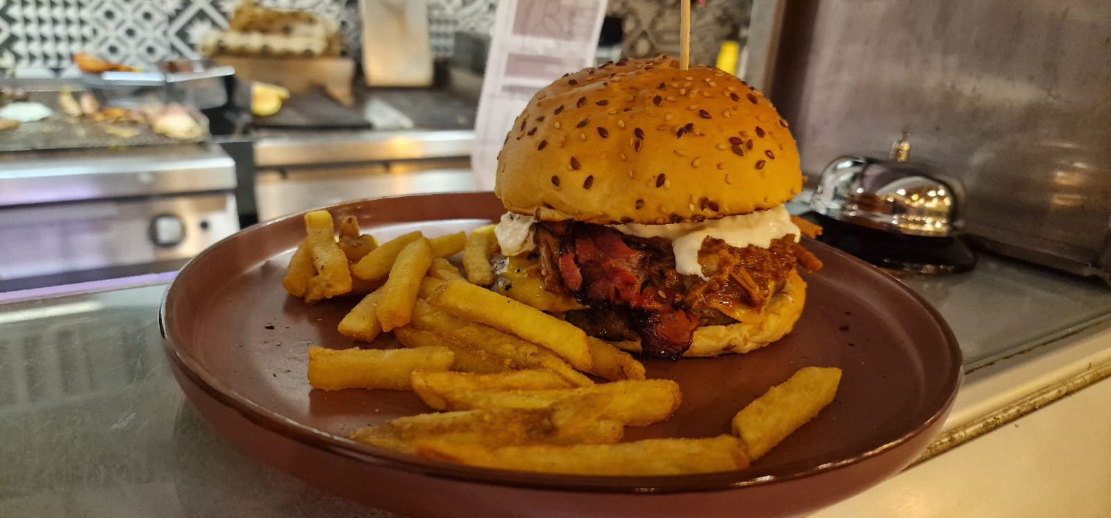 BUN AL SESAMO CON PULLED PORK ARTIGIANALE (HOMEMADE), INSALATA RUSSA , PATATINE FRITTE E KETCHUP